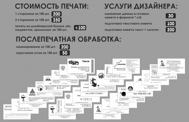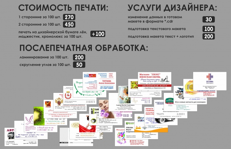 Более подробно с предложением Вы можете ознакомиться на сайте ниже, или на любой из наших точек приема заказов. Для Вашего удобства мы собрали в виде образцов различные виды печати на различных видах дизайнерских картонов. Надеемся, что это позволит Вам с большим удобством выбрать внешний вид Ваших визиток.