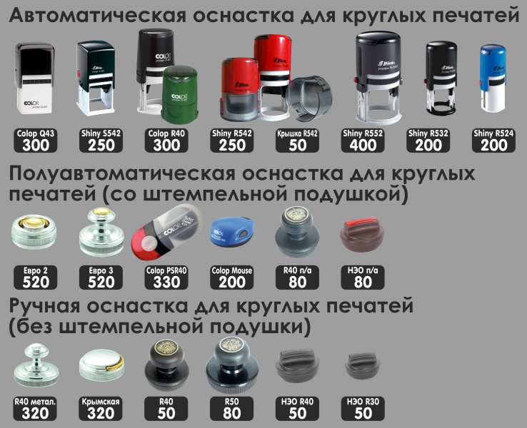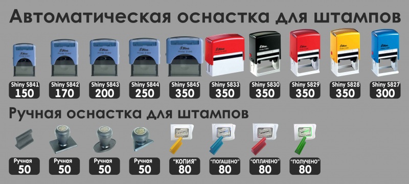 Компания "Пониграфика" поддерживает запас основных типов оснасток для печатей и штампов, распространенные виды нумераторов, датеров, аксессуаров и расходников ведущих производителей. Оснастки не включенные в основной ассортимент мы можем поставить на заказ в срок от 1 до 5 рабочих дней. Стоимость ручной оснастки для печати от 50 рублей, автоматической от 250 рублей. Образцы оснасток Вы можете видеть на иллюстрации или в любой из точек приема заказа (см. "Контакты").